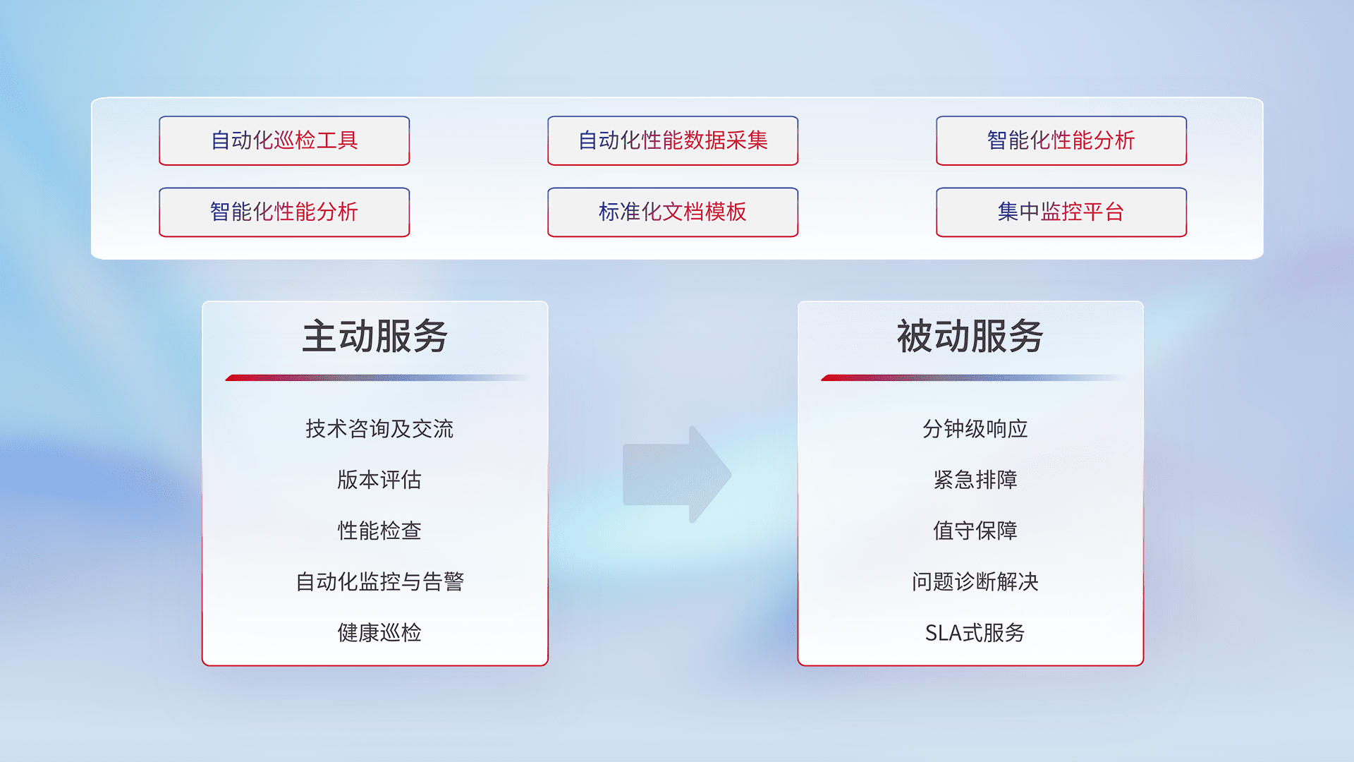 智能化工具和标准化文档,,保障服务质量,,提供主动服务(包含技术咨询、、、版本评估、、、性能检查、、、、自动化监控与告警、、、健康巡检)和被动服务包含(分钟级响应、、、紧急排障、、值守保障、、、问题诊断解决、、SLA服务)。。。。